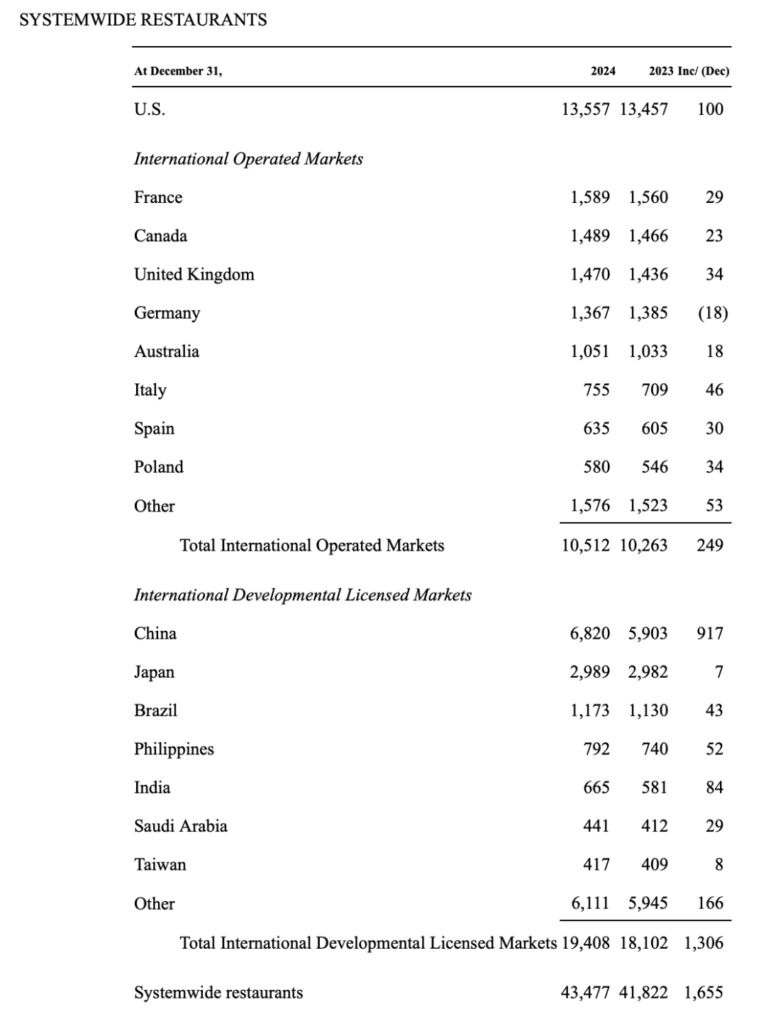 其中,美國市場門店數(shù)達到13557家,較2023年增加100家;國際運營市場門店數(shù)達到10512家,增長249家;國際特許經(jīng)營市場表現(xiàn)最為強勁,門店數(shù)達到19408家,增加了1306家。