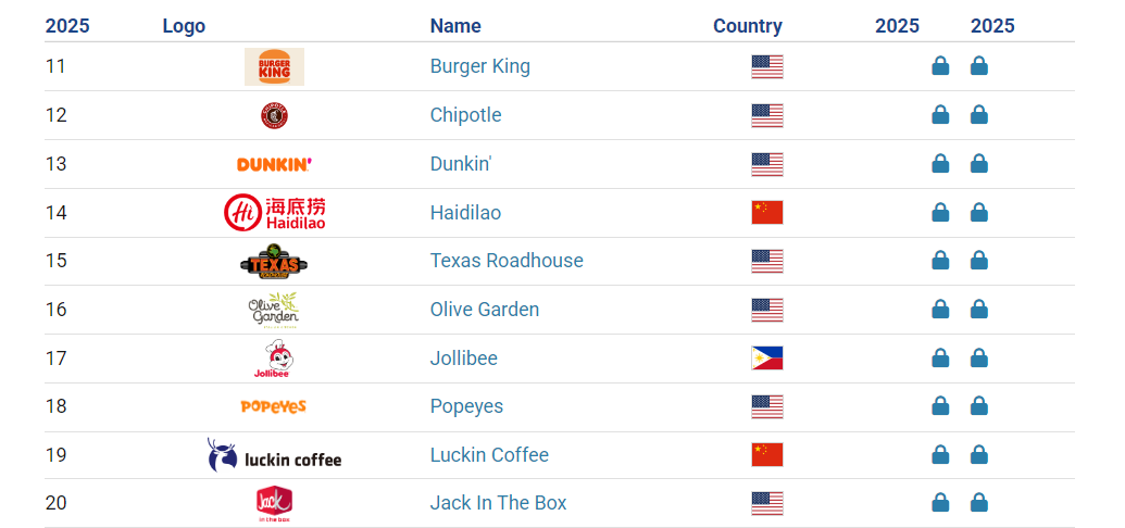 而一眾中國(guó)品牌,如海底撈、瑞幸,也首次同時(shí)躋身全球前二十,引發(fā)行業(yè)廣泛關(guān)注。
