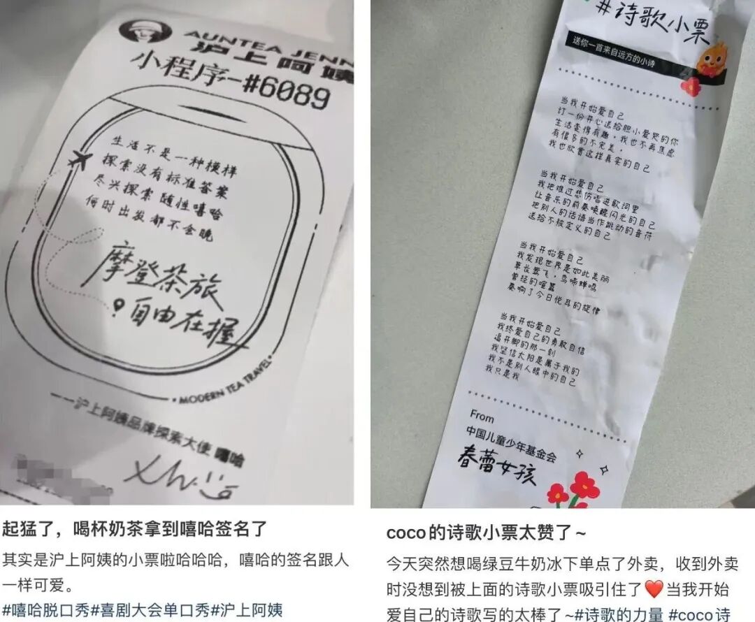 滬上阿姨與脫口秀演員合作,將心靈雞湯文案印在小票上:“生活不是一種模樣,探索沒有標(biāo)準(zhǔn)答案,盡興探索,隨性嘻哈,何時出發(fā)都不會晚”,引發(fā)年輕用戶廣泛分享。CoCo都可推出《我開始愛自己》系列小票詩歌,同樣觸達(dá)消費(fèi)者情緒。