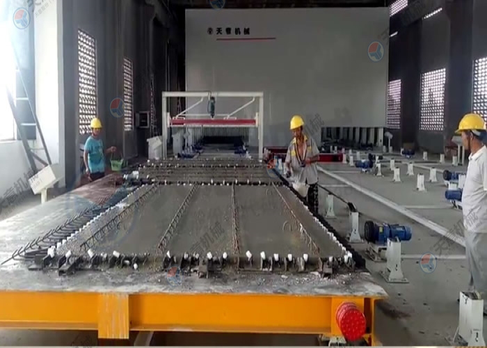 PC環(huán)形疊合板/內(nèi)墻板生產(chǎn)線的主要設(shè)備包括雙梁橋式起重機(jī)、清理機(jī)、脫模劑噴涂機(jī)、布料機(jī)、振動(dòng)臺(tái)、趕平機(jī)、拉毛裝置、預(yù)養(yǎng)窯、抹光機(jī)、碼垛車、養(yǎng)護(hù)窯、翻轉(zhuǎn)機(jī)、擺渡車、支撐滾輪、驅(qū)動(dòng)輪、模臺(tái)和成品運(yùn)輸車等。